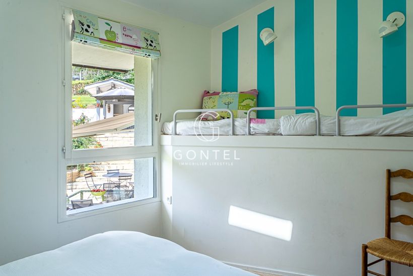 L'espace nuit comprend cinq chambres réparties sur plusieurs niveaux. La suite parentale dispose d'une salle de bain privative, tandis qu'une autre chambre bénéficie d'une salle de douche. Les trois autres chambres partagent une salle de bain commune. La maison est équipée d'un chauffage au sol dans toutes les pièces, assurant un confort thermique optimal toute l'année, ainsi que d'une buanderie, d'une cave et d'un sauna.