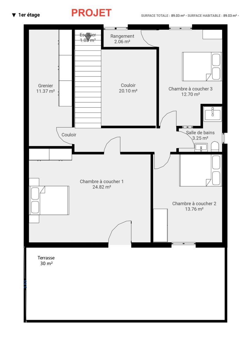 Étage : 89m² avec la possibilité de réaliser 3 chambres avec une ou deux salles de bains.