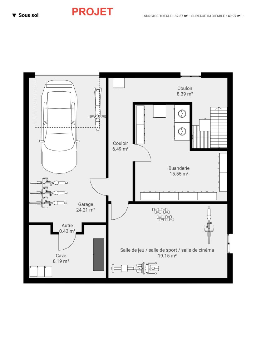 Sous-sol semi-enterré : 82m² dont 50m² habitables avec fenêtres en hauteur. Espace idéal pour buanderie, salle de cinéma ou salle de sport (hauteur sous plafond : 2.50m)